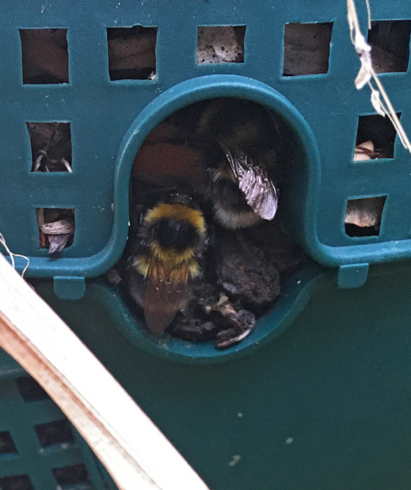 We have a hanging planter with about a dozen holes around it, which some bumblebees have been using as a place to rest overnight.
