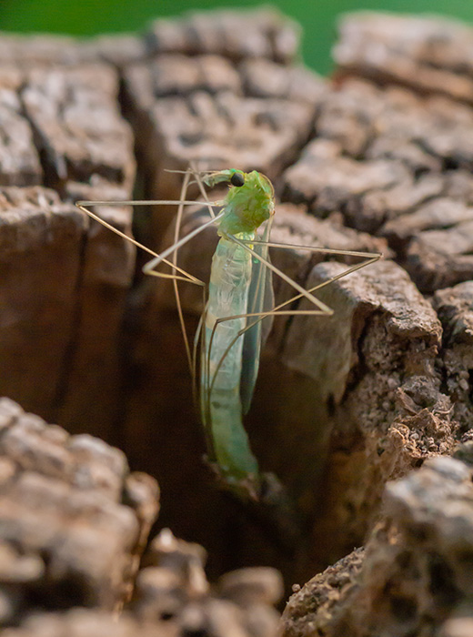 An adult crane fly emerges from its pupa in an old tree stump.