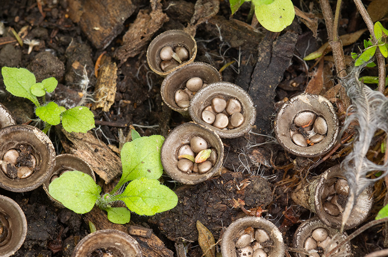 I found some birds nest fungus while weeding in the garden. Each body is about 5mm across.