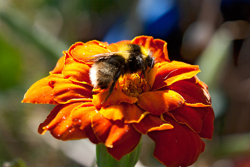 A bumblebee having a bit of a rest on a marigold in the early morning light. He woke up soon after and flew away.