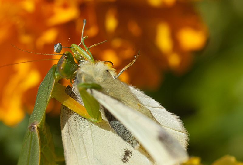 A praying mantis feasts on a white butterfly.