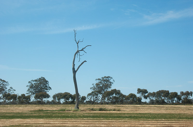 A tree standing in the middle of a crop field, taken from the Overland train which runs between Melbourne and Adelaide.