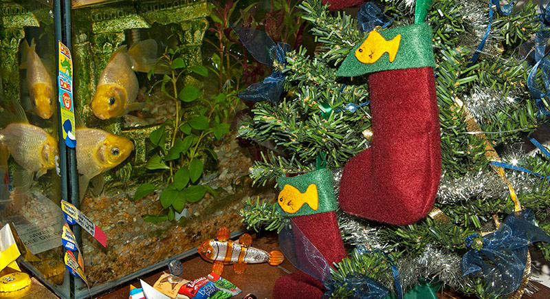 A couple of our fish check out their fishy socks on the fishymas tree.